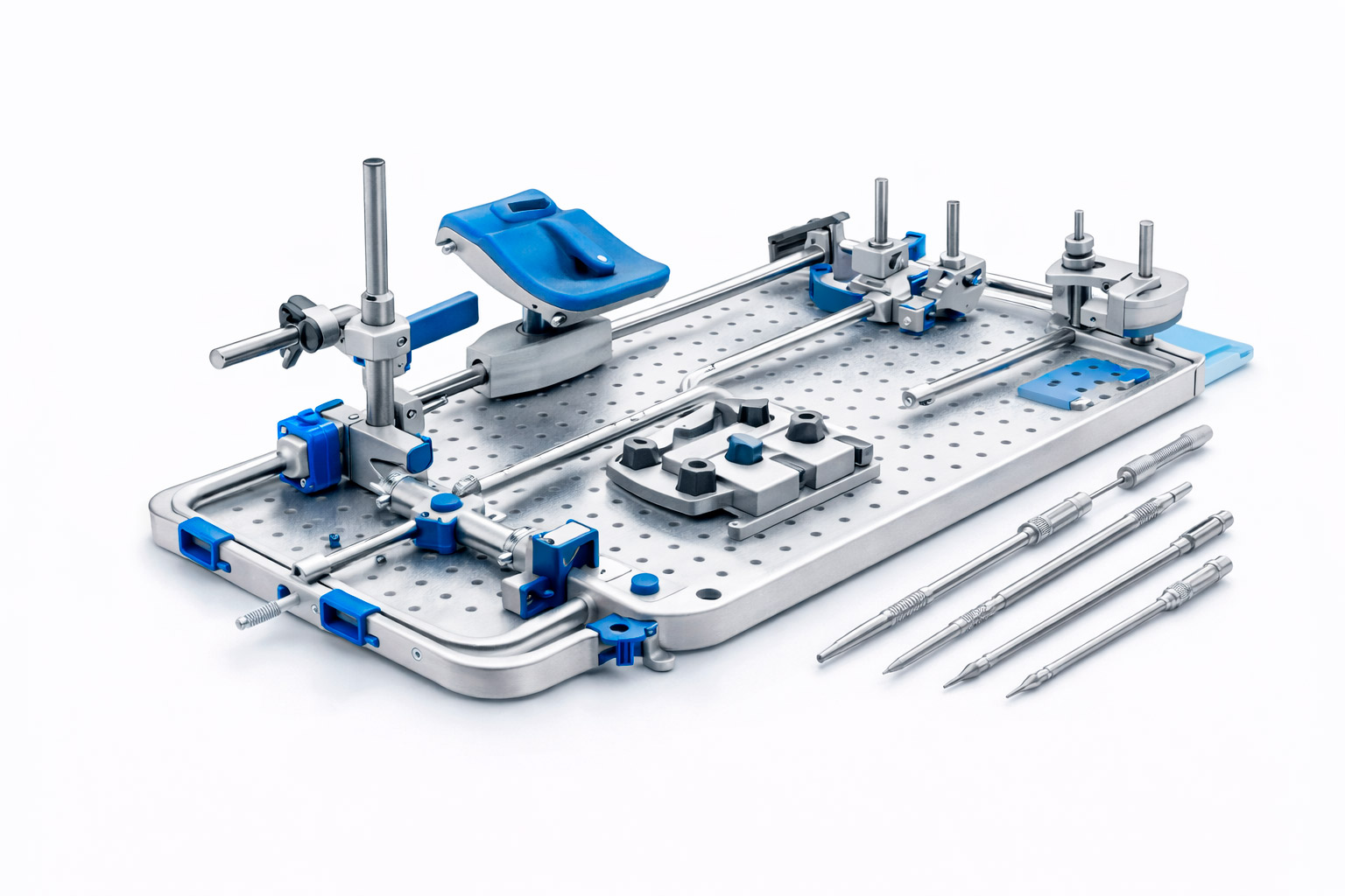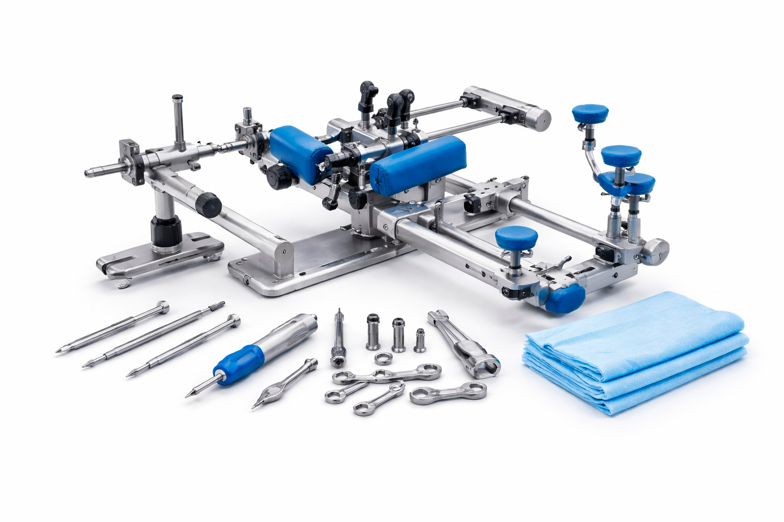 Equipamiento e instrumental clínico para procedimientos craneales y de columna de alta precisión.